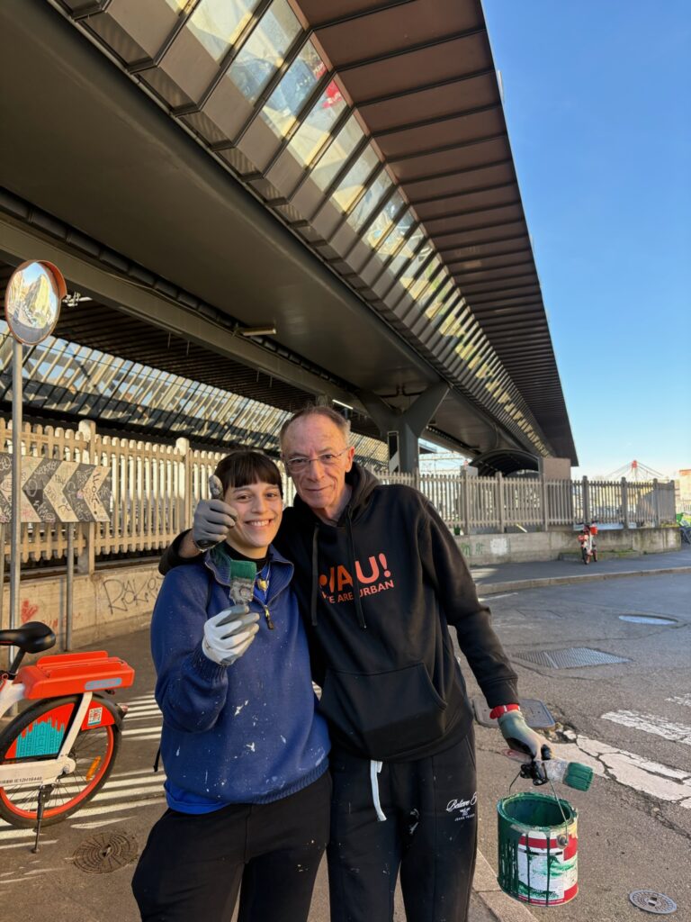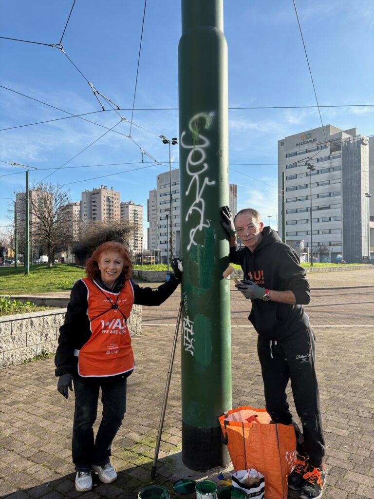 Accanto alla raccolta di mozziconi, plastica e rifiuti, è stato svolto anche un intervento di manutenzione leggera: colore e piccoli ritocchi hanno permesso di sistemare pali e cestini davanti alla stazione, arredi spesso trascurati ma centrali nella percezione dello spazio urbano.